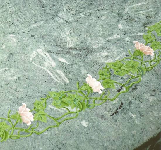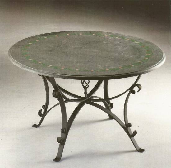 Tavolo in ferro battuto zincato e verniciato con piano in verde guatemala di diametro cm.130 dipinto con motivo floreale