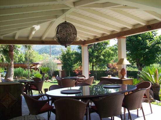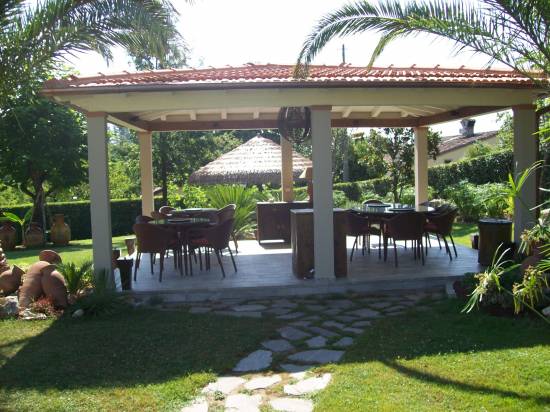 Gazebo a padiglione di mq. 40,0 laccato. struttura in abete lamellare con pilastri e travi dimensionati secondo calcoli strutturali Copertura con tegola in laterizio