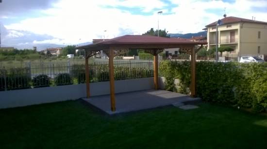 Struttura in abete lamellare con pilastri e travi dimensionati secondo calcoli strutturali . Copertura con perlinato e tegola canadese