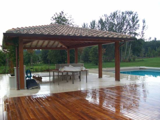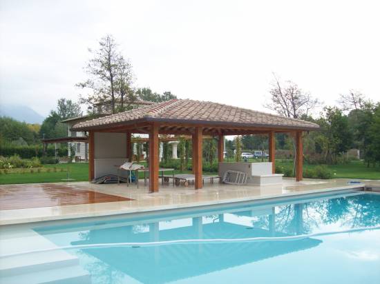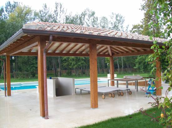 Struttura in abete lamellare con pilastri e travi dimensionati secondo calcoli strutturali .Copertura a padiglione con perlinato laccato , guaina ardesiata e coppo toscano in laterizio