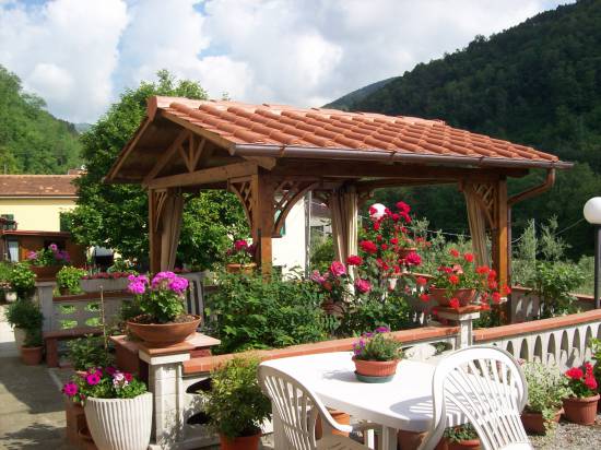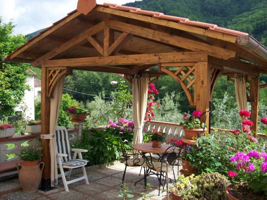 Struttura in abete lamellare con capriate . Pilastri e travi dimensionati secondo calcoli strutturali . Copertura con perlinato . guaina e tegola toscana in polipropilene .